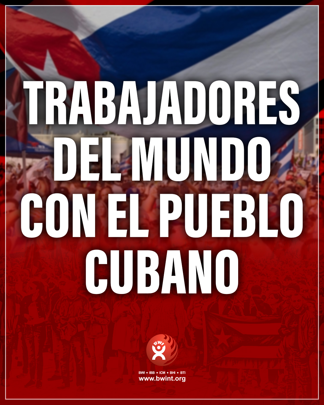 L'Internationale des Travailleurs du Bâtiment et du Bois (IBB) appelle ses affiliés à exprimer leur solidarité avec le peuple cubain et, en particulier, avec le Syndicat National des Travailleurs du Bâtiment de Cuba (SNTC), membre associé spécial de l’IBB, à travers la campagne « Travailleurs du Monde avec le Peuple Cubain ».